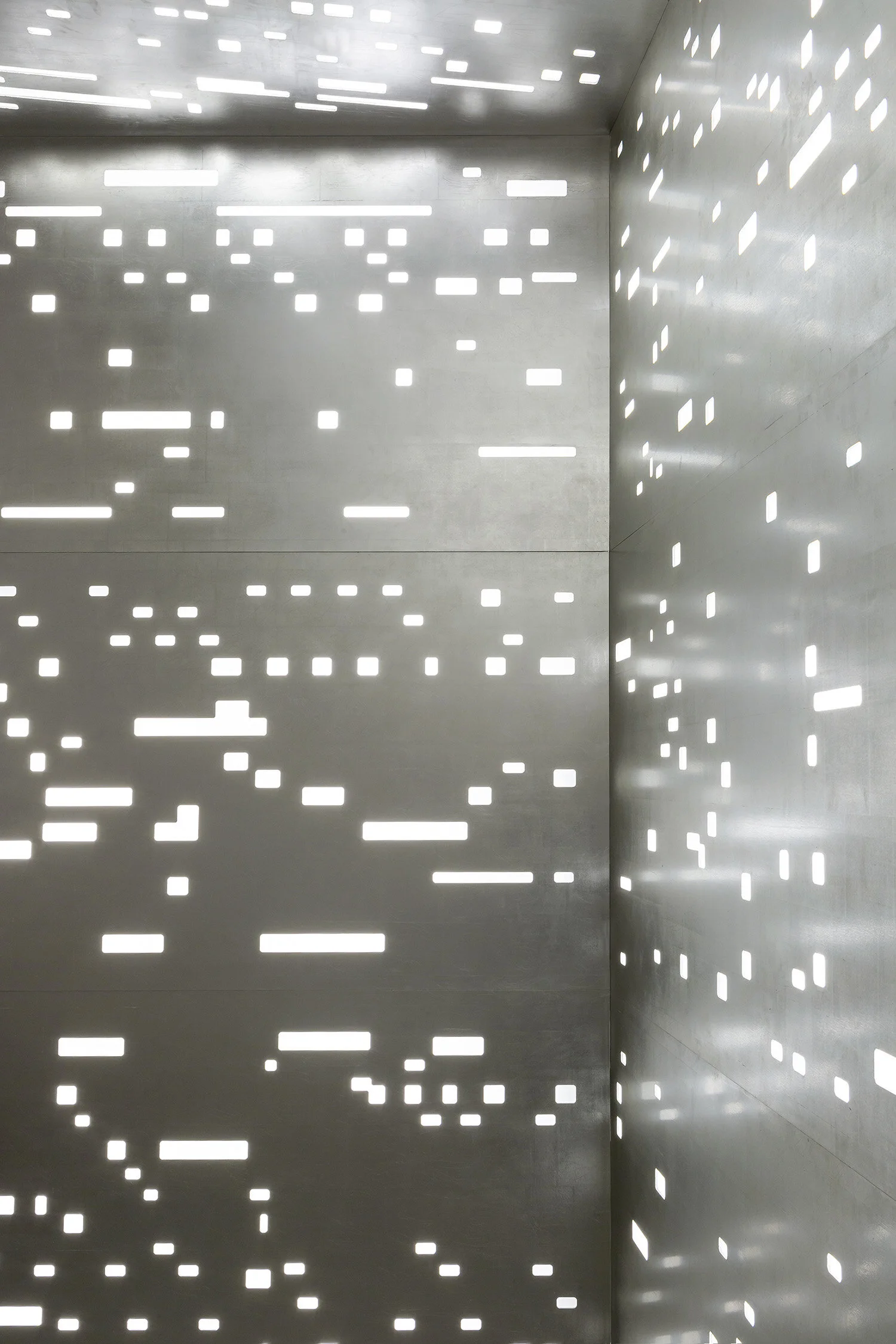 In the lobby, light is used as a sculptural material to interpret music. To do this, 23 custom backlit panels were fabricated using the score of Duke Ellington songs visualized like patterns on player piano rolls. The surfaces of the panels were hand gilded with aluminum leaf. Light glows through the notes and creates a three-dimensional aura. The dramatic effect, seen from the street, is striking and draws people into the building.